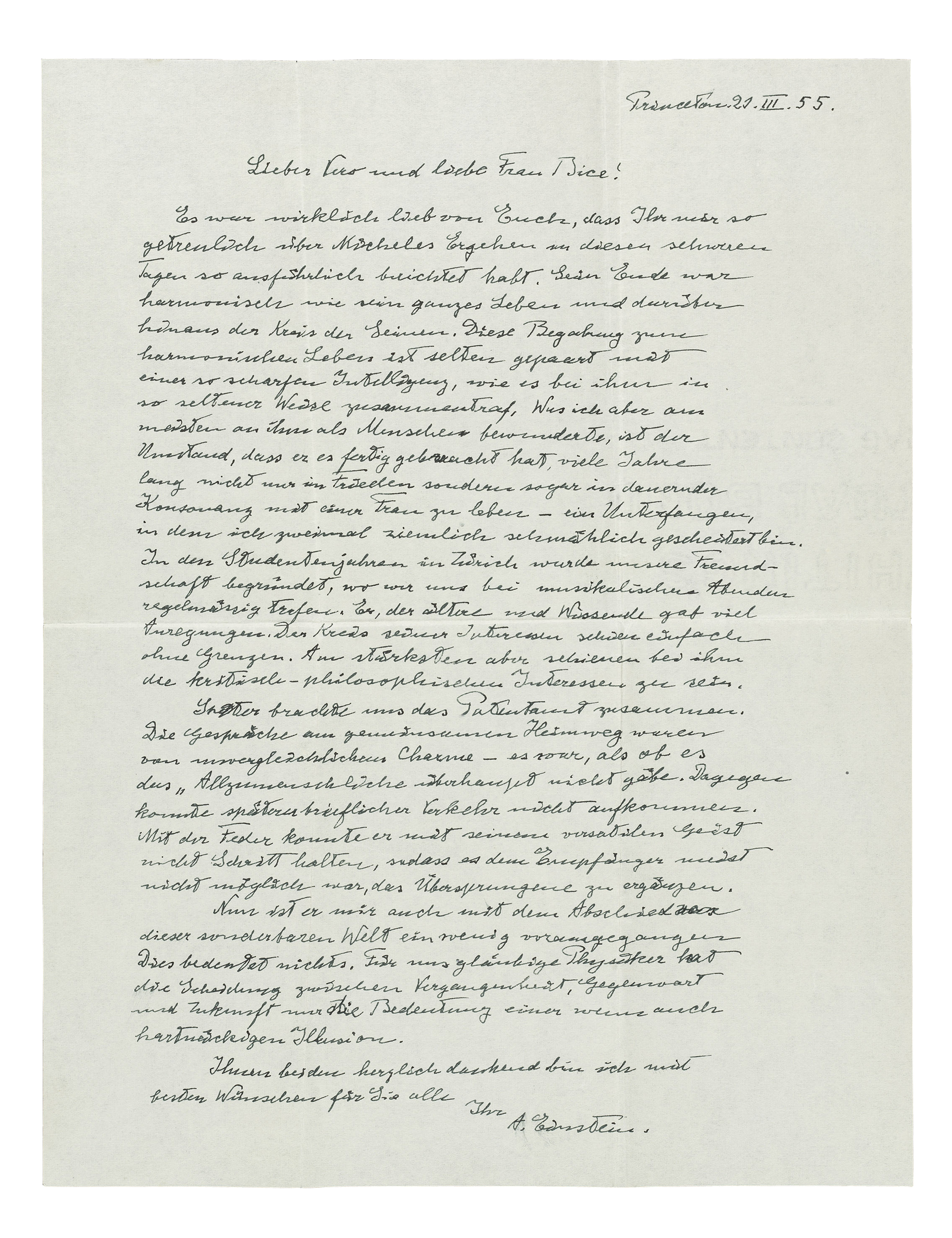 Einstein Albert 1879 1955 Autograph Letter Signed A Einstein To Michele Besso S Son Vero And Sister Bice Rusconi Lieber Vero Und Liebe Frau Bice Princeton 21 March 1955
